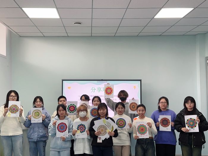 活动伊始,为了让同学们更快的融入团体,彼此信任,让同学们签订了团辅活动承诺书,让大家在一个安全充满信任的环境中展开活动。代彭彦老师向同学们介绍了曼陀罗花的意义、结构,曼陀罗绘画疗法的由来,以及荣格与曼陀罗的关系等,让同学们对曼陀罗绘画有个初步的了解。然后让大家在舒缓的音乐中,选择舒适的姿势,通过音乐冥想,在舒缓的音乐中放下近期内心的焦虑与不安,让自己放松下来。随后让同学们选择一张自己最喜欢的或者最能代表自己的曼陀罗绘画纸,并讲述自己选择的理由。同学们在宁静舒缓的音乐中用自己喜欢的颜色,涂鸦自己的曼陀罗,在不断涂色描绘中,把心中的情绪用色彩表达出来。最后,代彭彦老师带领同学们按照拆分联想法的方式进行曼陀罗绘画的解读。通过为曼陀罗命名,列出颜色和图案进行联想,表达曼陀罗主题的方式,让同学们对自己内心有了更深入的了解。活动结束后纷纷留言,并表示感受到了曼陀罗绘画的魅力,获益匪浅。