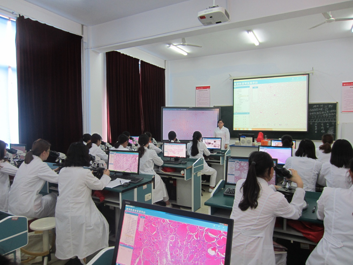 中心秉承“医教协同、任务驱动、模块运行、技能为本”的教学理念。中心配备奥利巴斯显微互动系统、数字化人体解剖教学系统、BL-422I信息化信号处理系统等先进设备。其中,显微互动系统实现组织结构实时观测与师生双向交互,BL-422I系统集成生物信号采集、数据分析及无纸化报告功能,数字化解剖系统支持从二维到三维重建的全维度学习。同时建有离体器官灌流、小动物生理监测、神经电生理等特色实验模块,配套全自动生化分析仪、五分类血细胞检测系统等临床级检验设备,形成基础医学与临床技能贯通的实训链条。
