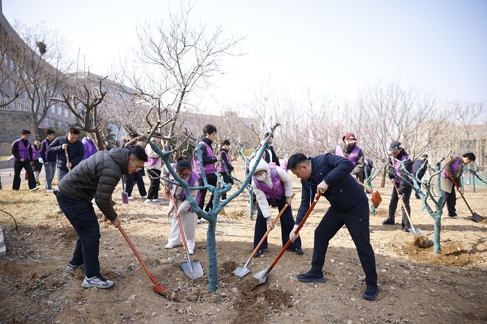 为弘扬生态文明理念,美化校园环境,3月12日,医学院学生管理副院长赵丰年带领辅导员及学生志愿者,在校园内开展义务植树活动。