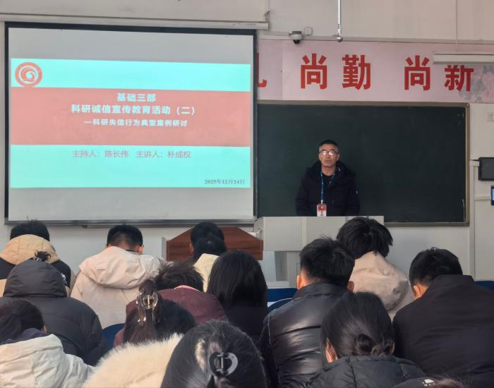 更新时间:2025-12-26 15:55 12月24日下午,基础三部在杏坛楼A206开展科研诚信宣传教育活动。活动由教研室主任、学科带头人陈长伟教授主持,侯超文、朴成权老师主讲,旨在强化教师科研诚信意识,营造求真务实的学术环境。