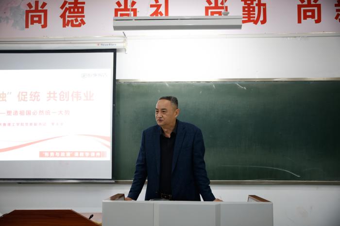 2026年4月9日,学校党委副书记李大华为商学院学生以“反‘独’促统共创伟业——塑造祖国必然统一大势”为主题,进行了一堂立意深远、内涵丰富的爱国主义思政课,厚植青年学生家国情怀,凝聚反“独”促统思想共识,引领学子坚定爱国信念,勇担统一使命。
