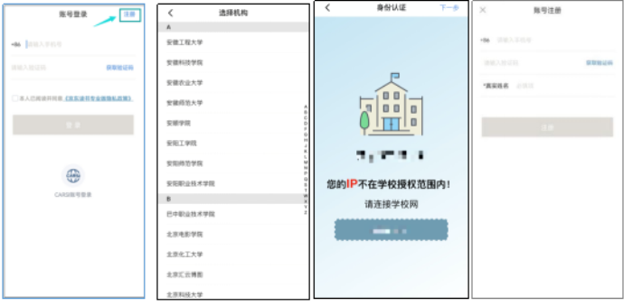 需连接校园网进行注册,否则身份认证页面提示“不在IP范围内”。完成账号注册后,日常访问不限制IP,校内校外都可以使用。