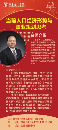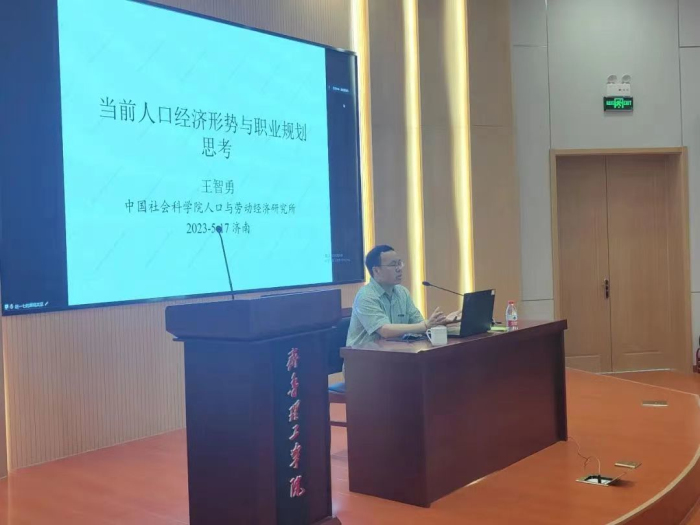本次讲座邀请了中国社会科学院人口与劳动经济研究所研究员、中国社会科学院大学教授、博士生导师、人口经济学研究室主任王智勇。王教授以《当前人口经济形势与职业规划思考》为题,主要从中国的人口经济形势、人力资本及其演变、职业规划思考和大学生如何规划自己的职业生涯四个方面做了较为详细和深刻的阐述,给同学们带来更多的启迪和震撼,整个讲座既通俗易懂又振聋发聩。