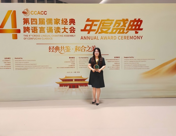 更新时间:2025-08-15 15:19 近日,由尼山世界儒学中心、中国孔子基金会等联合主办的第四届儒家经典跨语言诵读大会圆满落幕。文学院学子凭借扎实的语言功底、深厚的文化理解与出色的舞台表现,在近三万件参赛作品中脱颖而出,共获一等奖2项、二等奖2项、三等奖5项及优秀奖1项。其中,2022级英语专业于佳卉同学作为优秀代表,受邀出席大会年度盛典,展现了我院学子的风采。