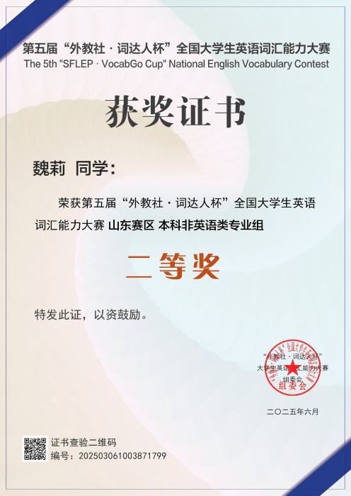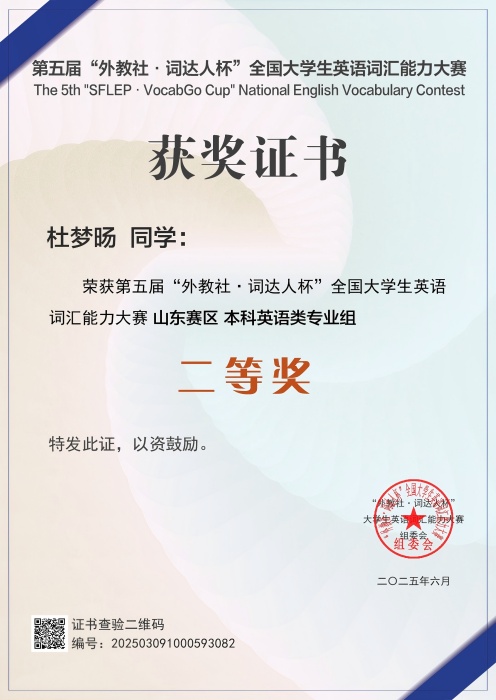 更新时间:2025-08-22 13:35 近日,第五届“外教社・词达人杯”全国大学生英语词汇能力大赛圆满落幕。我校学子踊跃参赛,经校赛、省赛、国赛层层角逐,42人晋级省赛并喜获佳绩。获本科非英语类专业组二等奖2项、三等奖4项,英语类专业组二等奖1项、三等奖1项。