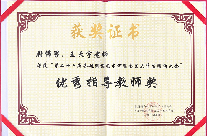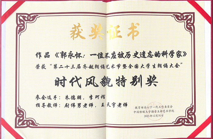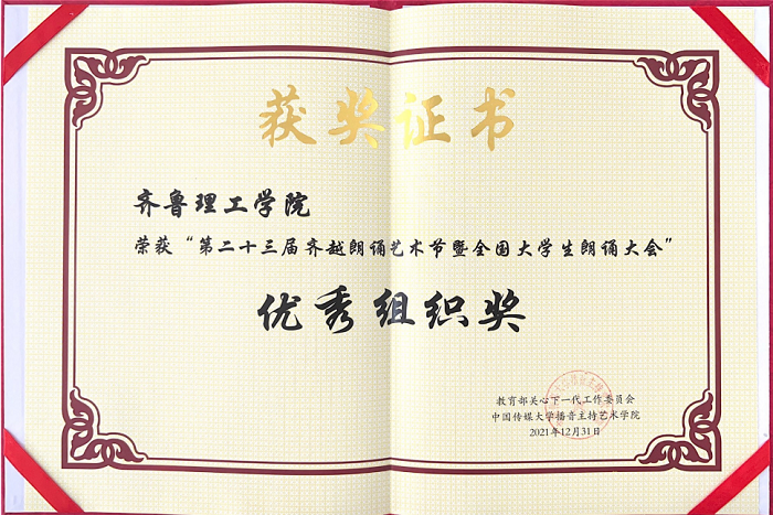 以“回望历史,对话未来”为主题的第23届齐越朗诵艺术节暨全国大学生朗诵大会已圆满收官。齐鲁理工学院荣获本届大会的“优秀组织奖”,新闻与传播学院教师尉伟男、王天宇获得“优秀指导教师奖”,2019级播音与主持艺术专业学生朱德朋、李珂熠朗诵的作品《郭永怀:一位不应被历史遗忘的科学家》获本届大会设立的特别奖项“时代风貌特别奖”。