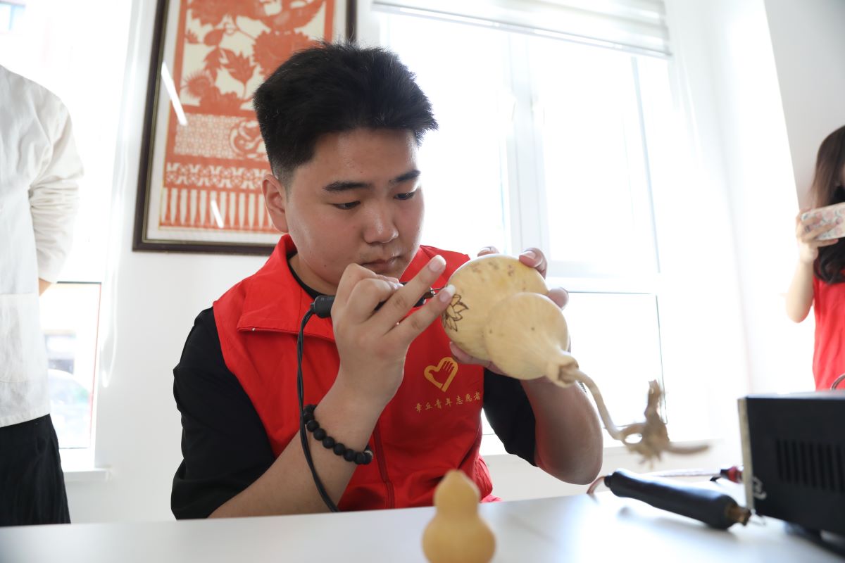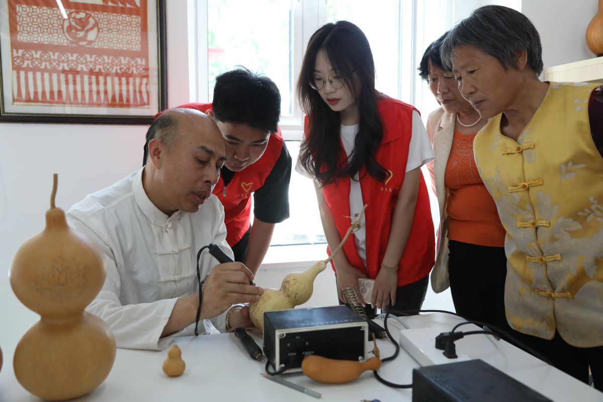活动伊始,社区负责人发表讲话,阐述活动目的与意义,并详细介绍主要流程。随后,非遗传承人马新波老师进行葫芦烙画授课与现场演示。马老师以极大的文化责任感和使命感传授非遗文化,让学生和居民直观感受葫芦烙画文化魅力,并鼓励学生动手实践。随后,学生和社区居民在马老师的指导和社区工作人员帮助下体验葫芦烙画以及漆扇制作,在实践中领略非遗文化的博大精深。
