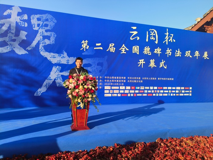 更新时间:2023-10-22 14:09 10月21日上午,由山西省委宣传部、大同市政府、中央数字电视书画频道共同主办的“云冈杯”第二届全国魏碑书法双年展在古都大同北魏文化园开幕,我校艺术学院书法学郝长森老师作为获奖者受邀参加了本次系列活动,其创作的魏碑作品在此次展览中获得了评委及观者的广泛好评。