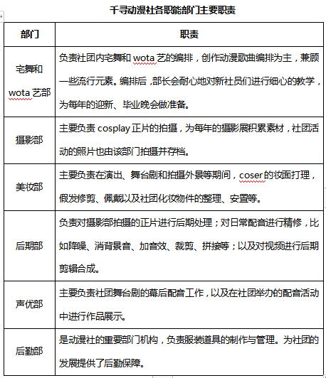 千寻动漫社设有社长、副社长各一名,下设宅舞和wota艺部、摄影部、美妆部、后期部、声优部和后勤部六个活动部门。本社团禀着健康积极向上的原则,丰富校园文化生活,我们希望能够以多样的社团活动,充实同学们的课余生活,锻炼同学们动手动脑的能力,一起创造一个丰富多彩的大学回忆。