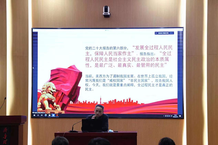 3月14日晚上,党委副书记李大华在济南校区学术报告厅主会场,作了题为“全过程民主才是真正的民主”的二十大精神专题辅导报告。济南校区分会场圆阶教室、曲阜校区分会场会议室视频同步进行。学校第五次学生代表大会的254名学生代表全部参加了报告会。