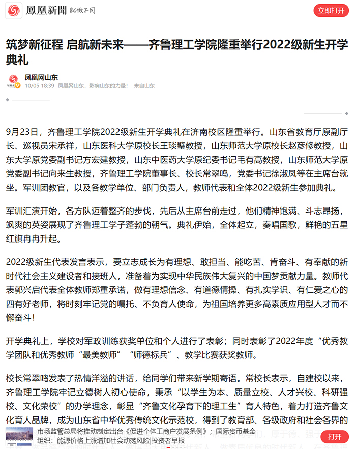 凤凰网:筑梦新征程 启航新未来——齐鲁理工学院隆重举行2022级新生开学典礼