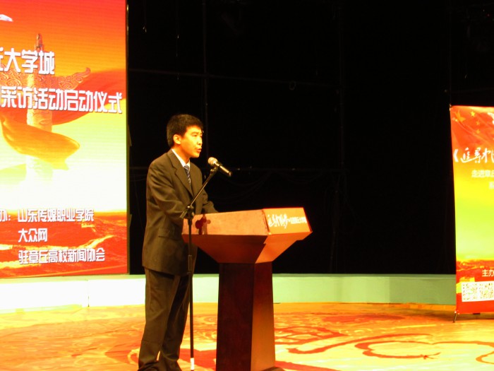 苏占兵副书记在启动仪式上代表驻章丘高校作了讲话,他指出,本次专题采访活动,对于挖掘同学们身边的典型人物和先进事迹,对探寻当代大学生们的“中国梦”具有十分积极的意义。这既为我们加强社会主义核心价值观教育提供了一个良好的思路,也为我们提供了梳理本校先进典型的机会,更为章丘各高校提供了一个很好的宣传平台。我院会以此为契机,进一步弘扬社会主义核心价值观,鼓舞和激励全校师生共同追寻美丽的“中国梦”。最后,苏占兵副书记衷心的祝愿此次活动能够取得圆满成功。