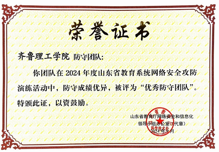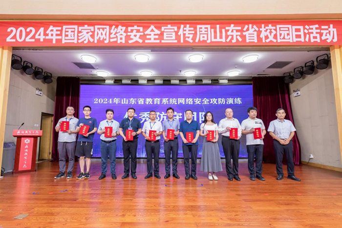 近日,2024年国家网络安全宣传周山东省校园日活动启动仪式在威海举行。启动仪式上,公布了我省2024年度教育系统网络安全攻防演练活动获奖团队,由我校网络信息中心组建的团队成绩优异,被评为“优秀防守团队”,团队成员荣获“优秀奖”。